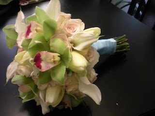 This bouquet is for one of the beautiful brides I'm working with. She chose calla lilies, green cymbidium orchids, sahara roses and yellow tulips wrapped in tiffany blue ribbon.